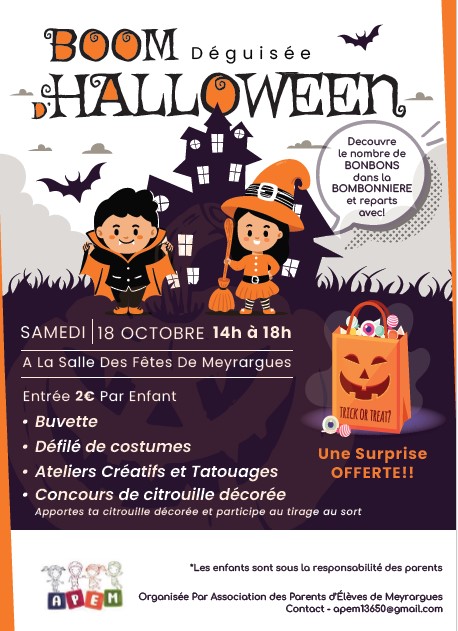Nous vous attendons nombreux pour la boum d’halloween, organisée par l’Apem : samedi 18 octobre de 14h à 18h à la salle des fêtes.