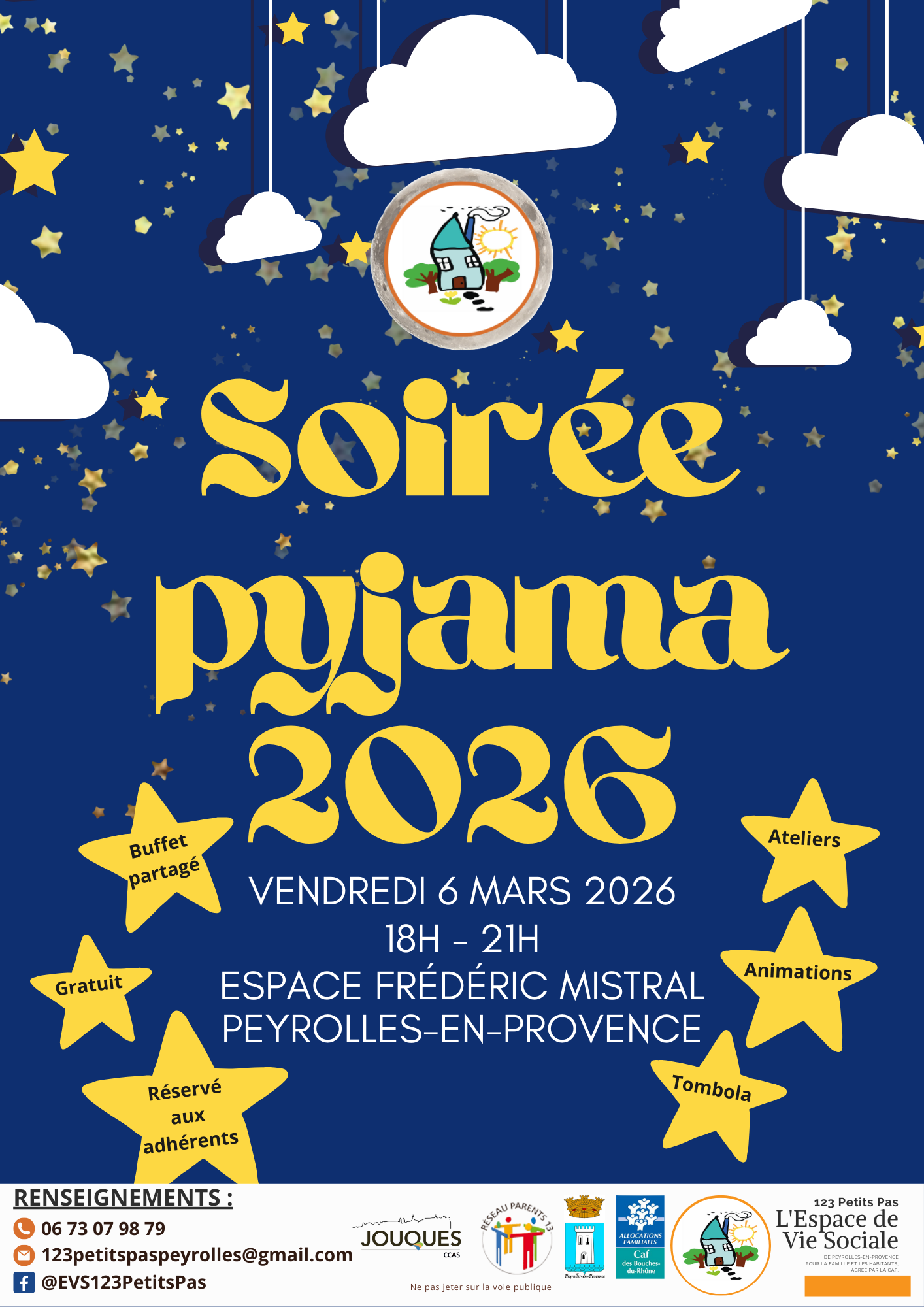Dans le cadre du partenariat du CCAS de Meyrargues et l’Association 123 PETITS PAS, organisation de la SoirĂ©e Pyjama le vendredi 6 mars. C’est une soirĂ©e conviviale et familiale qui s’adresse Ă  tous nos adhĂ©rents, donc Ă©galement aux habitants de la commune de Meyrargues.
