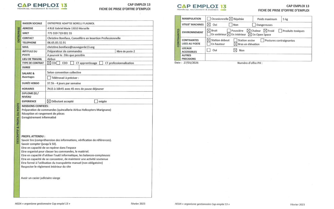 Annonce concernant 2 postes – spécifique TH –  avec une Entreprise Adaptée. Le recrutement est opéré dans le cadre de leur sous-traitance avec Airbus, leur site se situe à Marignane. Une navette part tous les jours de l’EA (13010) pour aller sur le site. Les salariés peuvent aussi rejoindre librement le site d’Airbus.